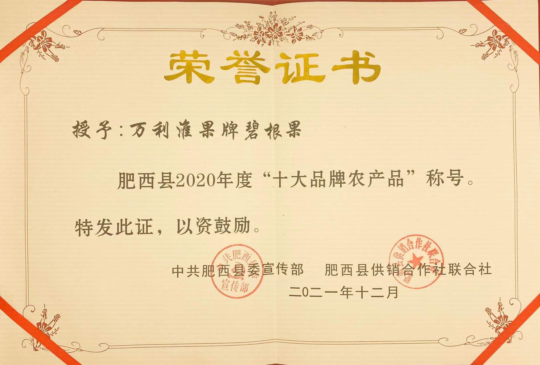 2021年12月8日,關于肥西縣2020年度“十強農(nóng)民專業(yè)合作社”、“十大品牌農(nóng)產(chǎn)品”、“十佳‘三農(nóng)’人物”表彰會于肥西縣政府二樓會議室舉行。我司“萬利淮果”品牌碧根果榮獲肥西縣2020年度“十大品牌農(nóng)產(chǎn)品”稱號。