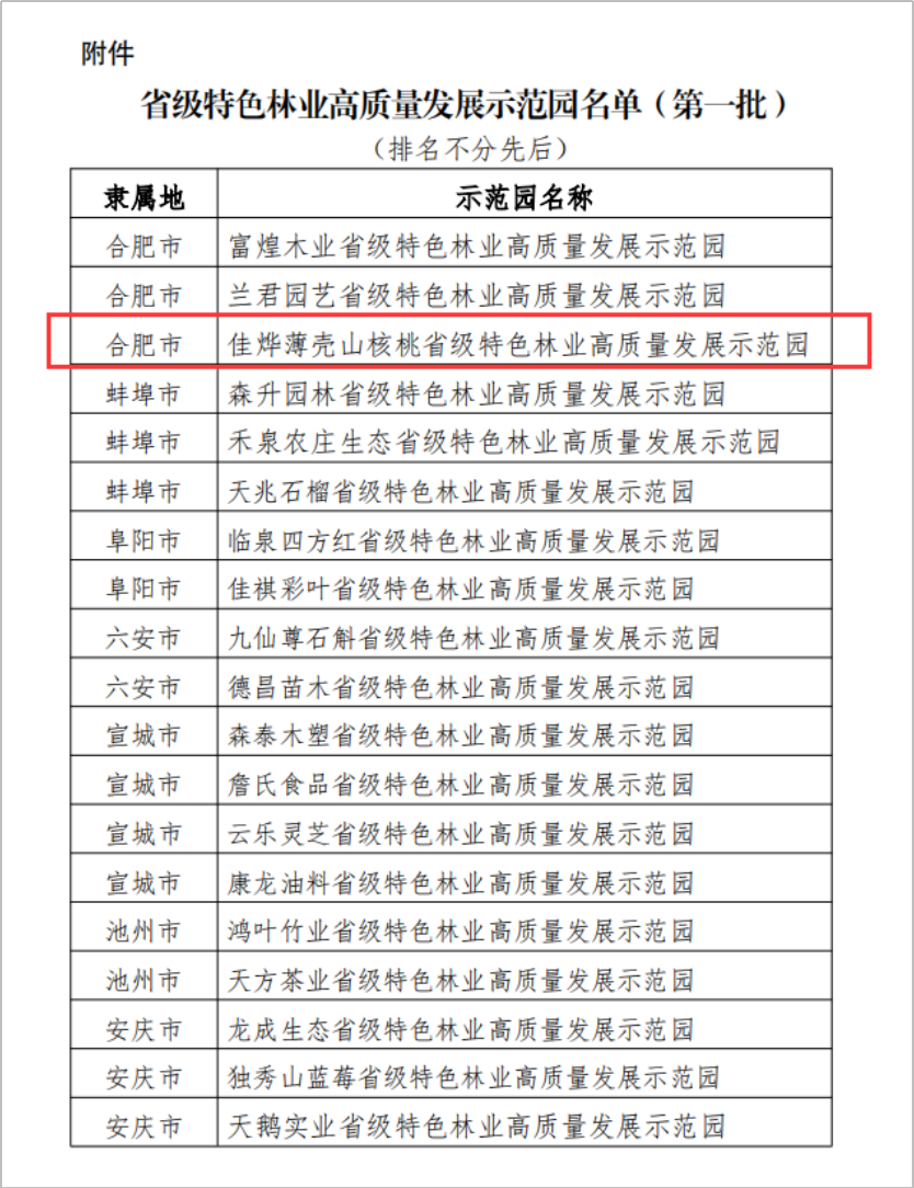 近日,安徽省林業(yè)局公布了“第一批省級(jí)特色林業(yè)高質(zhì)量發(fā)展示范園”企業(yè)名單。經(jīng)主體申報(bào)、材料初審、實(shí)地復(fù)核、專家組評(píng)審、安徽省林業(yè)局局長辦公會(huì)審定和公示,安徽佳燁薄殼山核桃基地憑借綜合實(shí)力,正式被認(rèn)定為“第一批省級(jí)特色林業(yè)高質(zhì)量發(fā)展示范園”。