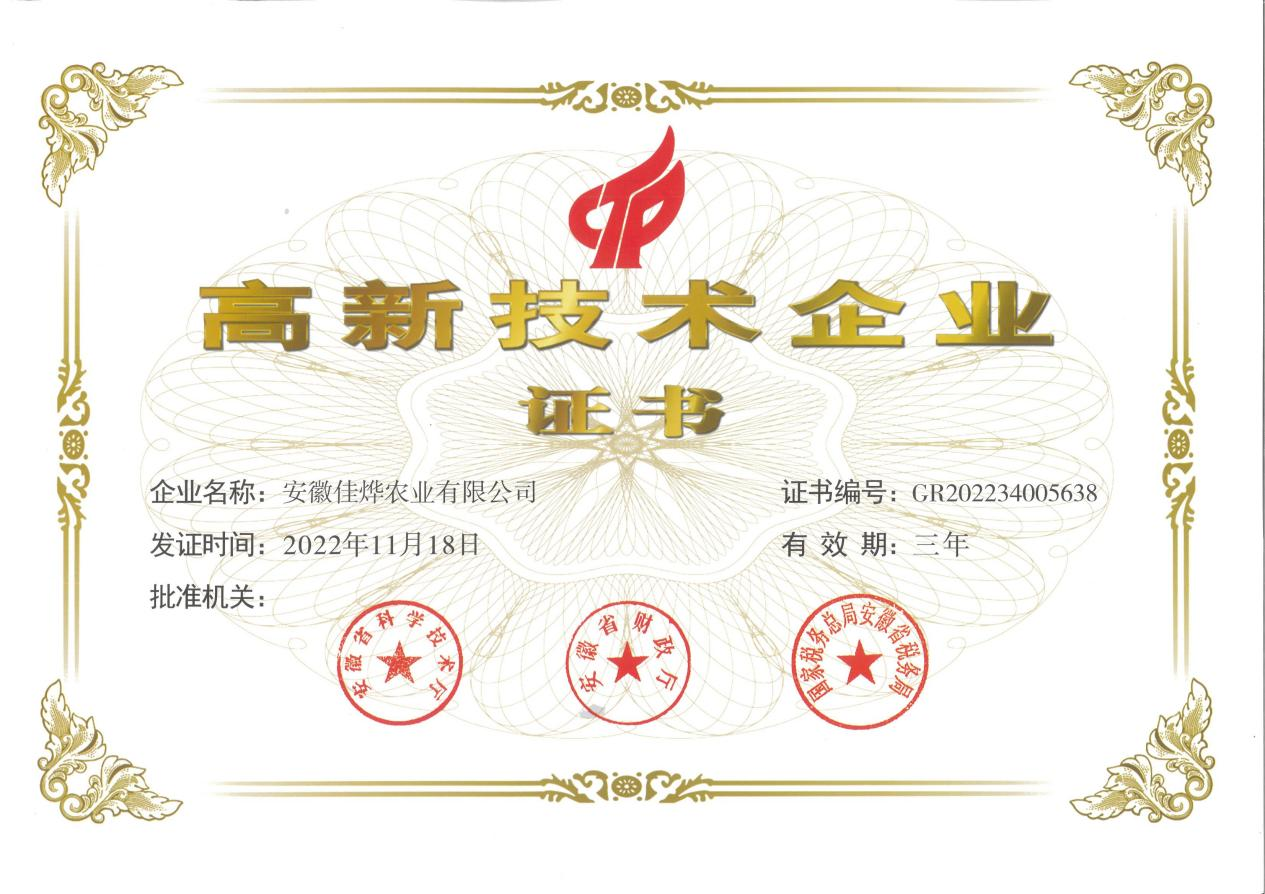 根據(jù)安徽省科學(xué)技術(shù)廳公布的“安徽省2022年第二批高新技術(shù)企業(yè)名單”,經(jīng)縣、市、省相關(guān)部門層層審核,全國高新技術(shù)企業(yè)認(rèn)定管理工作領(lǐng)導(dǎo)小組辦公室最終評審,我公司正式被認(rèn)定為“高新技術(shù)企業(yè)”,同時公司于2023年2月8日正式取得由安徽省科學(xué)技術(shù)廳、安徽省財政廳、國家稅務(wù)總局安徽省稅務(wù)局聯(lián)合頒發(fā)的“高新技術(shù)企業(yè)”證書(證書號:GR202234005638)。