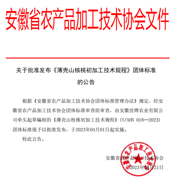 2023年4月1日,安徽省農(nóng)產(chǎn)品加工技術(shù)協(xié)會正式發(fā)布實施了由我公司安徽佳燁農(nóng)業(yè)有限公司主持編制的《薄殼山核桃初加工技術(shù)規(guī)程》(T/AHN 018—2023)團體標準,此標準的實施進一步統(tǒng)一、規(guī)范了薄殼山核桃采后加工與產(chǎn)品質(zhì)量,對提高薄殼山核桃市場競爭力和推動產(chǎn)業(yè)可持續(xù)發(fā)展具有重要作用。